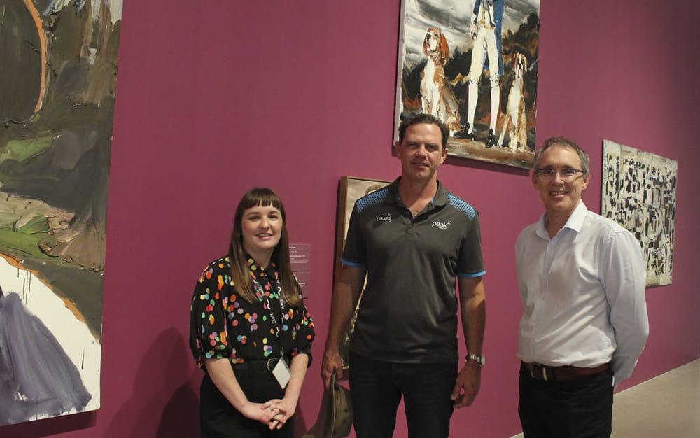 1/ Rockhampton Museum of Art staff members stand in front of Cook and Hounds II by Paul Ryan